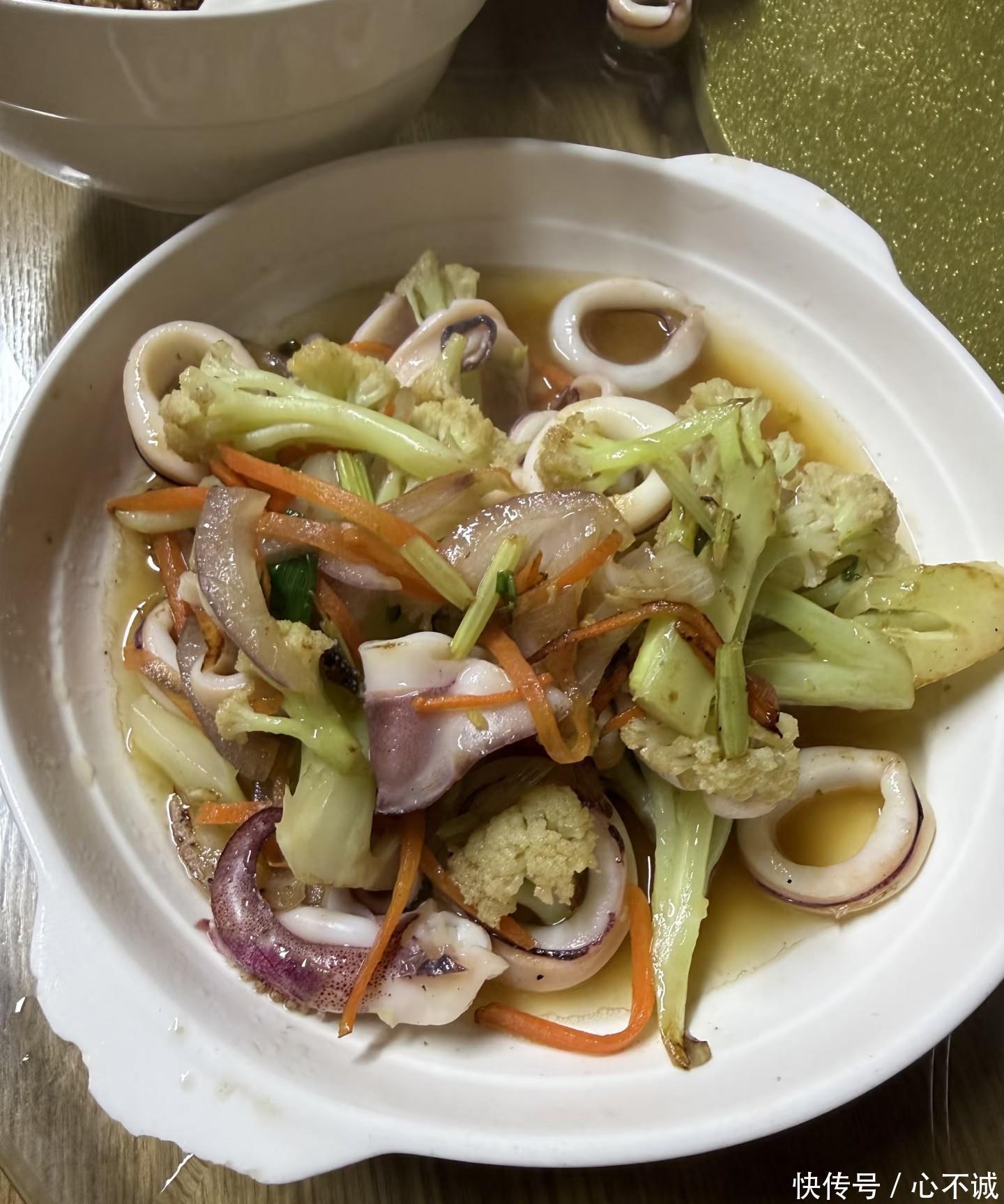 她打卡了本地的小吃店,餐桌上一盘炒鱿鱼搭配花菜,看着就香到流口水;晚上喝的饮品杯口还插着一朵红玫瑰,文艺又接地气;